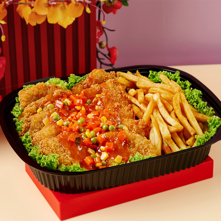 Sweet & Sour Sauce with Chicken Chop and French Fries. Available for delivery from 3 Feb - 3 Mar 2026 (Closed 17-18 Feb). All images are for illustration purposes only.