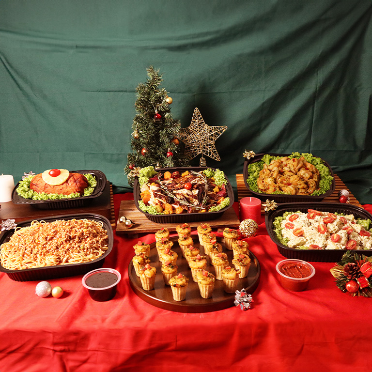 Treat yourself with our Holly Jolly Set. Featuring our Rosemary Chicken with Roasted Vegetables, Christmas Chicken Ham, Spaghetti Chicken Bolognese, Potato Salad, ,Chimichurri Prawn and our DIY Kueh Pie Tee (35pc) with stewed turnips & prawns. Available for delivery from 1-31 Dec 2025. All images are for illustration purposes only.