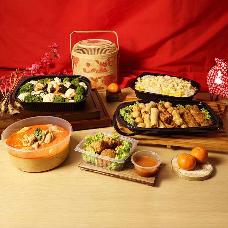Our classic Fried White Bee Hoon and Curry Chicken Set comes with Stir Fried Cabbage Flowers, Mixed Platter (Chicken Ngoh Hiang 10pc, Fried Spring Rolls 10pc, Fried Fishballs 10pc, Fried Prawn Rolls 10pc & Fried Cuttlefish Balls 10pc) and Handmade Crispy Tofu Ball (10pc). Add on Yusheng (Mock Abalone/Abalone). Available for delivery from 3 Feb - 3 Mar 2026 (Closed 17-18 Feb). All images are for illustration purposes only.