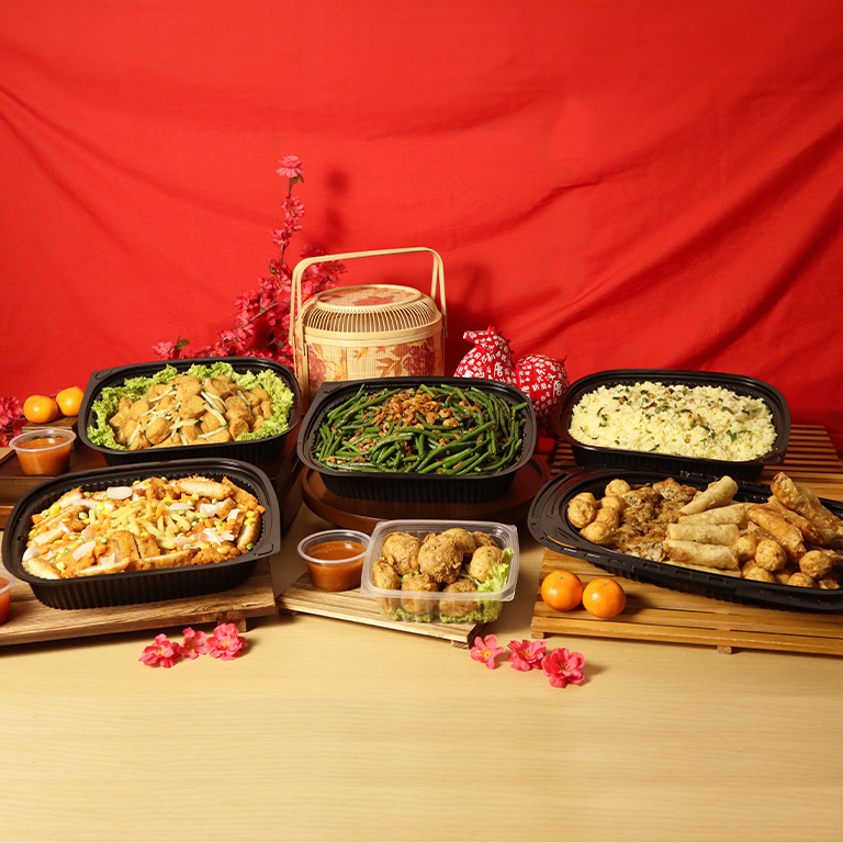 Our Hainanese Chicken Cutlet with Golden Egg Fried Rice Set, comes with Stir Fried Baby French Beans, Mixed Platter (Chicken Ngoh Hiang 10pc, Fried Spring Rolls 10pc, Fried Fishballs 10pc, Fried Prawn Rolls 10pc & Fried Cuttlefish Balls 10pc), Thai Style Egg Tofu and Handmade Crispy Tofu Ball (10pc). Add on Yusheng (Mock Abalone/Abalone). Available for delivery from 3 Feb - 3 Mar 2026 (Closed 17-18 Feb). All images are for illustration purposes only.