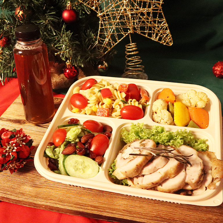 Celebrate the holidays with our Newly Roasted Chic Roll Bento featuring our X'mas Roasted Chicken Roll, Roasted Vegetables, Lemon Thyme Cranberry Salad, Fusilli Mixed Bean Salad & Homemade Ice Lemon Tea. Top up $5.80 for Dessert & Mini Cake. Min. order of 6 bentos. Available for delivery from 1 Dec - 31 Dec 2025. All images are for illustration purposes only.