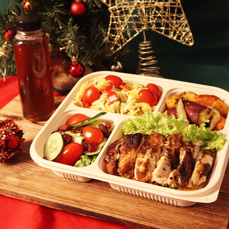 Celebrate the holidays with our Rosemary Chic Bento featuring our Rosemary Chicken, Roasted Vegetables, Lemon Thyme Cranberry Salad, Fusilli Mixed Bean Salad & Homemade Ice Lemon Tea. Top up $5.80 for Dessert & Mini Cake. Min. order of 6 bentos. Available for delivery from 1 Dec - 31 Dec 2025. All images are for illustration purposes only.