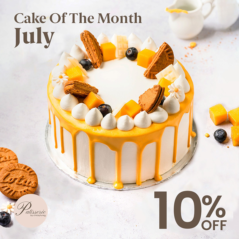 Celebrate July with our Mango Fresh Cream. This July's special cake combines fluffy chiffon, sweet mango and fresh cream to make a beautifully fruity & sweet cake. Brightly decorated with cookies, mango cubes, blueberries and drip décor, it will lift up any occasion with a smile.